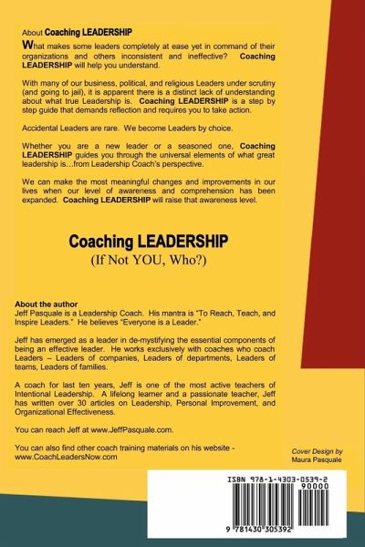 This book explains the Hows and Whys of great leadership and great leadership coaching. Leadership Coach Jeff Pasquale reveals Six Core Leadership Behaviors in a self-coaching format. The first three behaviors (Authenticity, Simplicity, and Consistency) set a strong foundation; the next three (Empowerment, Inspiration, & Serving Others) are external actions that support and enhance the first three. This book will guide you through each point, so that you can become better at leading by intention or coaching leaders.