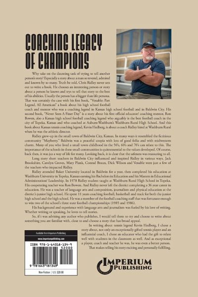 Why take on the daunting task of trying to tell another person's story? Especially a story about a man so revered, admired and known by so many. Truth be told, Chris Ridley never sets out to write a book. He chooses an interesting person or story about a person he knows and tries to tell that story to the best of his abilities. Usually, the person has a bigger than life persona. That was certainly the case with his first book, "Venable: Part Legend, All American" a book about his high school football coach and mentor who was a coaching legend in Kansas high school football and in Baldwin City. His second book, "Never Seen A Finer Day" is a story about his first official educator/ coaching mentor, Ron Bowen, also a Kansas high school football coaching legend who arguably is the best football coach in the city of Topeka, Kansas and who coached at Auburn-Washburn's Washburn Rural High School. And this book about Kansas tennis coaching legend, Kevin Hedberg, is about a coach Ridley hired at Washburn Rural when he was the athletic director. Ridley grew up in the small town of Baldwin City, Kansas. In many ways, it resembled the fictitious community "Mayberry." Baldwin was a peaceful utopia with lots of good folks and with midwestern charm. Many of you who lived a small town childhood in the 50's, 60's and 70's can relate to this. The importance of the schools in these small communities is quintessential to the values developed. Of course, back then, it was just a way of life for many. Looking back, it is clear that the safeness was reassuring to all. Long story short teachers in Baldwin City influenced and inspired Ridley in various ways. Jack Brookshire, Carolyn Groves, Mary Plank, Conrad Braun, Dick Wilson and Venable were just a few of the teachers who impacted Ridley. Ridley attended Baker University located in Baldwin for a year, then completed his education at Washburn University in Topeka, Kansas earning his Bachelors in Education and his Masters in Educational Administration/ Leadership. In 1978 Ridley student taught at Washburn Rural High School in Topeka. His cooperating teacher was Ron Bowen. And Ridley never left the district completing a 36-year career in education. He was a teacher of language arts and composition, journalism and physical education at the district's junior high school. He spent 11 years coaching football, basketball, and track for both the junior high school and the high school. He was a member of the football coaching staff that was fortunate enough to win two of the school's three state football championships (1985 and 1986). His background and experience with language arts and journalism was fueled by his love of writing. Whether writing or speaking, he loves to tell stories. So, if i was advising any author who publishes, I would tell them to try and choose to write about something you are familiar with, close to and choose a story that has broad appeal. In writing about tennis legend Kevin Hedberg, I chose a story about, not only an exceptionally gifted tennis player and an influential coach, I chose an educator who had the gift to relate well with students in the classroom as well. And as exceptional a player, coach, and teacher he was, he was even a better person. That makes telling his story exciting and personally fulfilling.