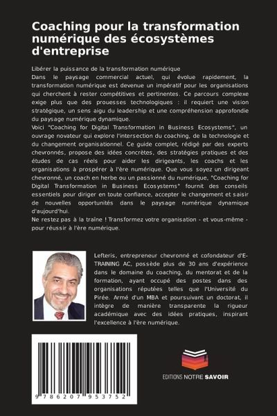 Libérer la puissance de la transformation numériqueDans le paysage commercial actuel, qui évolue rapidement, la transformation numérique est devenue un impératif pour les organisations qui cherchent à rester compétitives et pertinentes. Ce parcours complexe exige plus que des prouesses technologiques : il requiert une vision stratégique, un sens aigu du leadership et une compréhension approfondie du paysage numérique dynamique.Voici "Coaching for Digital Transformation in Business Ecosystems", un ouvrage novateur qui explore l'intersection du coaching, de la technologie et du changement organisationnel. Ce guide complet, rédigé par des experts chevronnés, propose des idées concrètes, des stratégies pratiques et des études de cas réels pour aider les dirigeants, les coachs et les organisations à prospérer à l'ère numérique. Que vous soyez un dirigeant chevronné, un coach en herbe ou un passionné du numérique, "Coaching for Digital Transformation in Business Ecosystems" fournit des conseils essentiels pour diriger en toute confiance, accepter le changement et saisir de nouvelles opportunités dans le paysage numérique dynamique d'aujourd'hui.Ne restez pas à la traîne ! Transformez votre organisation - et vous-même - pour réussir à l'ère numérique.