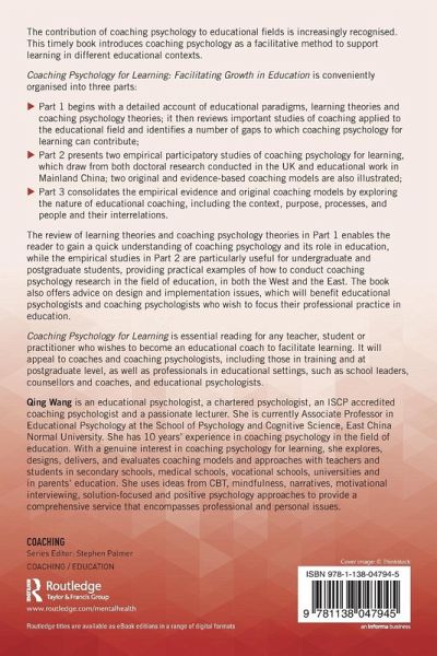 Qing Wang is an educational psychologist, chartered psychologist, an ISCP accredited coaching psychologist and a passionate lecturer. She is currently Associate Professor in Educational Psychology at the School of Psychology and Cognitive Science of East China Normal University. She has 10 years' experience in coaching psychology in the field of education. With a genuine interest in coaching psychology for learning, she explores, designs, delivers, and evaluates coaching models and approaches with teachers and students in secondary schools, medical schools, vocational schools, universities and in parents' education. She uses ideas from CBT, mindfulness, narratives, motivational interviewing, solution-focused and positive psychology approaches to provide a comprehensive service that encompasses professional and personal issues.
