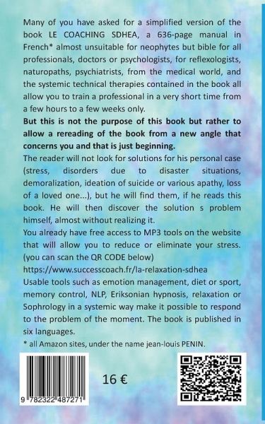 Many of you have asked for a simplified version of the book LE COACHING SDHEA, a manual of 636 pages in French_, almost unsuitable for newcomers, but biblical for all professionals, doctors or psychologists, for reflexologists, naturopaths, psychiatrists, from the medical world and the medical world, and the systemic technical therapies included in the book allow you to: to train a professional in a very short time, from a few hours to a few weeks.But that is not the purpose of this book, but rather to allow you to re-read the book from a new angle that concerns you and that is only just beginning.The reader will not look for solutions to his personal case (stress, disorders due to disaster situations, demoralization, suicidal thoughts or various apathies, loss of a loved one ...), but he will find them when reading this book. He will then find the solution to his problem on his own, almost without realizing it.You already have free access to MP3 tools on the site that can help you reduce or eliminate stress. https://www.successcoach.fr/la-relaxation-sdheaUsable tools such as emotion management, dietetics or sports, memory control, NLP, Eriksonian hypnosis, relaxation or sophrology in a systemic way allow you to respond to the problems of the moment. The book is published in six languages.