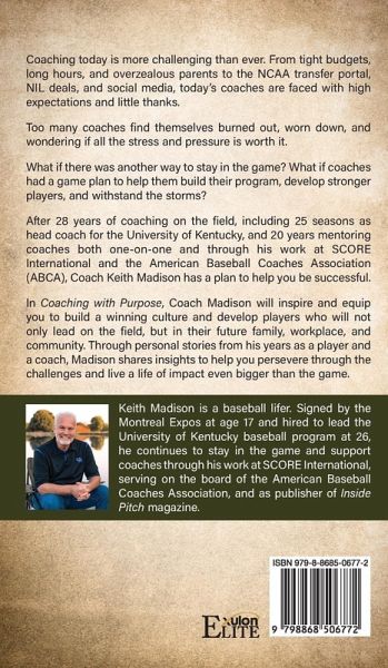 Coaching today is more challenging than ever. From tight budgets, long hours, and overzealous parents to the NCAA transfer portal, NIL deals, and social media, today's coaches are faced with high expectations and little thanks. Too many coaches find themselves burned out, worn down, and wondering if all the stress and pressure is worth it. What if there was another way to stay in the game? What if coaches had a game plan to help them build their program, develop stronger players, and withstand the storms? After 28 years of coaching on the field, including 25 seasons as head coach for the University of Kentucky, and 20 years mentoring coaches both one-on-one and through his work at SCORE International and the American Baseball Coaches Association (ABCA), Coach Keith Madison has a plan to help you be successful. In Coaching with Purpose, Coach Madison will inspire and equip you to build a winning culture and develop players who will not only lead on the field, but in their future family, workplace, and community. Through personal stories from his years as a player and a coach, Madison shares insights to help you persevere through the challenges and live a life of impact even bigger than the game. Keith Madison is a baseball lifer. Signed by the Montreal Expos at age 17 and hired to lead the University of Kentucky baseball program at 26, he continues to stay in the game and support coaches through his work at SCORE International, serving on the board of the American Baseball Coaches Association, and as publisher of Inside Pitch magazine.