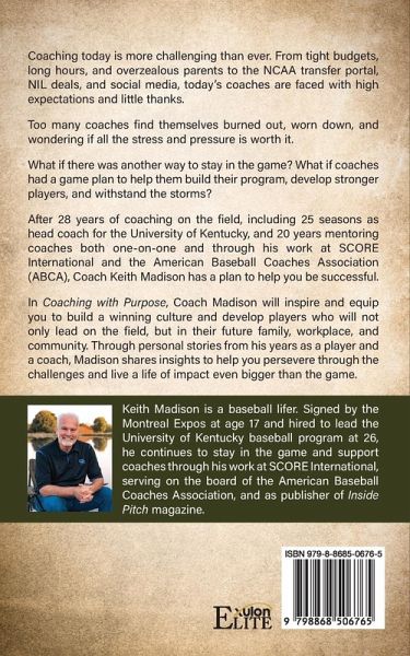 Coaching today is more challenging than ever. From tight budgets, long hours, and overzealous parents to the NCAA transfer portal, NIL deals, and social media, today's coaches are faced with high expectations and little thanks. Too many coaches find themselves burned out, worn down, and wondering if all the stress and pressure is worth it. What if there was another way to stay in the game? What if coaches had a game plan to help them build their program, develop stronger players, and withstand the storms? After 28 years of coaching on the field, including 25 seasons as head coach for the University of Kentucky, and 20 years mentoring coaches both one-on-one and through his work at SCORE International and the American Baseball Coaches Association (ABCA), Coach Keith Madison has a plan to help you be successful. In Coaching with Purpose, Coach Madison will inspire and equip you to build a winning culture and develop players who will not only lead on the field, but in their future family, workplace, and community. Through personal stories from his years as a player and a coach, Madison shares insights to help you persevere through the challenges and live a life of impact even bigger than the game. Keith Madison is a baseball lifer. Signed by the Montreal Expos at age 17 and hired to lead the University of Kentucky baseball program at 26, he continues to stay in the game and support coaches through his work at SCORE International, serving on the board of the American Baseball Coaches Association, and as publisher of Inside Pitch magazine.