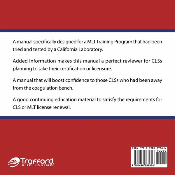 A manual specifically designed for a MLT Training Program that had been tried and tested by a California Laboratory. Added information makes this manual a perfect reviewer for CLSs planning to take their certification or licensure. A manual that will boost confidence to those CLSs who had been away from the coagulation bench. A good continuing education material to satisfy the requirements for CLS or MLT license renewal.