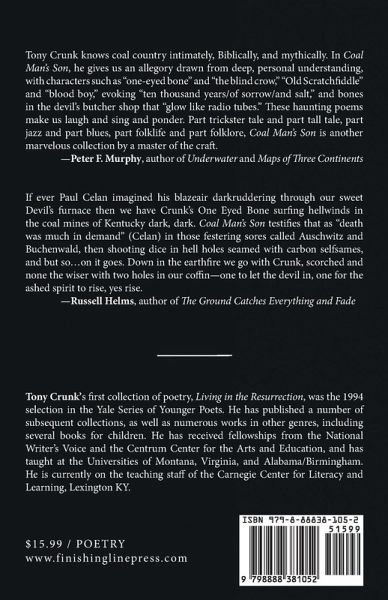 Coal Man's Son is a gothic coal-camp mad / sacred fever-dream that remythologizes the origins of both God and Man, and what came between them, in a suite of visionary poems feat. the triune Man Made of Fire, His Blind Crow and His One-Eyed Bone.