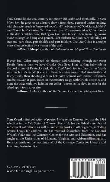 Coal Man's Son is a gothic coal-camp mad / sacred fever-dream that remythologizes the origins of both God and Man, and what came between them, in a suite of visionary poems feat. the triune Man Made of Fire, His Blind Crow and His One-Eyed Bone.