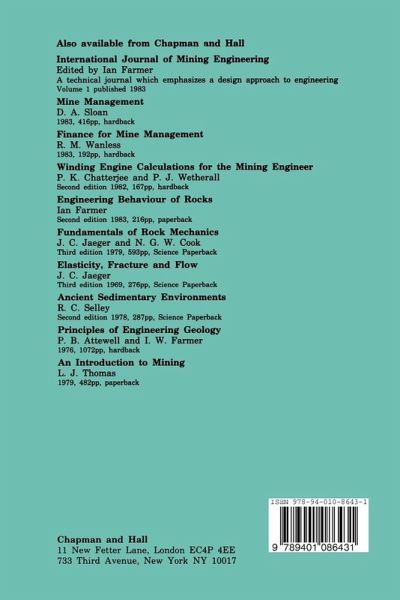 Coal Mine Structures is based on a six-year study, carried out at the University of Newcastle upon Tyne between 1976 and 1982 and financed by the National Coal Board and the European Coal and Steel Community (Projects 7220 - ACj806 and 7220 - ACj814), into the behaviour of under ground openings in British coal mines. The original work has been expanded to include other relevant British and international data. How ever, it remains, deliberately, a personal view based on a specific - albeit broad - research programme. It does not pretend to be a complete description of the behaviour of shafts, tunnels, rooms, pillars and long wall excavations. Nor does it set out to provide a manual for design. The specific aim is to show, often through consideration of quite detailed laboratory and field data, how the observed performance of some under ground structures during mining, can be explained by the deformation characteristics of the rocks which surround them. The work is based on observatiollB by many engineers working for the National Coal Board's Mining Research and Development Establishment, and by research associates and postgraduate students at the University of Newcastle upon Tyne. I am grateful to them all, but I am particularly indebted to Dr A. H. Wilson and Mr M. J. Bell of the National Coal Board, to Dr P. F. R. Altounyan, Dr P. Garritty, Dr P. Holmes, and Dr P. D. Shelton formerly of the University of Newcastle upon Tyne, to Dr R. N.