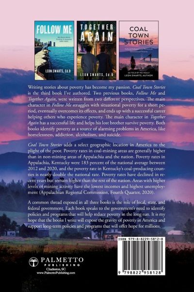Writing stories about poverty has become my passion. Coal Town Stories is the third book I've authored. Two previous books, Follow Me and Together Again, were written from two different perspectives. The main character in Follow Me struggles with situational poverty for a short period, eventually overcomes its effects, and ends up with a successful career helping others who experience poverty. The main character in Together Again has a successful life and helps his lost brother survive poverty. Both books identify poverty as a source of alarming problems in America, like homelessness, addiction, alcoholism, and suicide. Coal Town Stories adds a select geographic location in America to the plight of the poor. Poverty rates in coal-mining areas are generally higher than in non-mining areas of Appalachia and the nation. Poverty rates in Appalachia, Kentucky were 183 percent of the national average between 2012 and 2020, and the poverty rate in Kentucky's coal-producing counties is nearly double the national rate. Poverty rates have declined in recent years but remain higher than the rest of the nation. Areas with higher levels of mining activity have the lowest incomes and highest unemployment (Appalachian Regional Commission, Fourth Quarter, 2020). A common thread exposed in all three books is the role of local, state, and federal government. Each book speaks to the government's need to identify policies and programs that will help reduce poverty in the long run. It is my hope that the books I write will expose the gravity of poverty in America and support long-term policies and programs that will offer hope for millions.