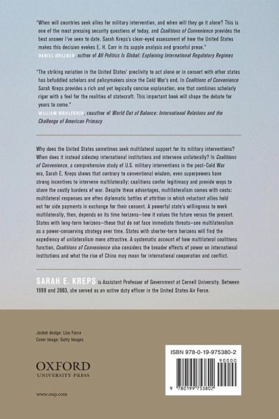When the Clinton Administration sent the United States military into Haiti in 1994, it first sought United Nations authorization and assembled a large coalition of allies. With a defense budget 20 times the entire GDP of Haiti, why did the US seek multilateral support when its military could quickly and easily have overpowered the 7,600-soldier Haitian army? The US has enjoyed unrivaled military power after the Cold War and yet in eight out of ten post-Cold War military interventions, it has chosen to use force multilaterally rather than going alone. Why does the US seek allies when, as the case of Haiti so starkly illustrates, it does not appear to need their help? Why in other instances such as the 2003 Iraq War does it largely sidestep international institutions and allies and intervene unilaterally? In Coalitions of Convenience, Sarah E. Kreps answers these questions through a study of US interventions after the post-Cold War. She shows that even powerful states have incentives to intervene multilaterally. Coalitions and international organization blessing confer legitimacy and provide ways to share what are often costly burdens of war. But those benefits come at some cost, since multilateralism is less expedient than unilateralism. With long time horizons--in which threats are distant--states will welcome the material assistance and legitimacy benefits of multilateralism. Short time horizons, however, will make immediate payoffs of unilateralism more attractive, even if it means foregoing the longer-term benefits of multilateralism. Coalitions of Convenience ultimately shows that power may create more opportunities for states such as the US to act alone, but that the incentives are stacked against doing so. The implications of the argument go beyond questions of how the US uses force. They speak to questions about how the world works when power is concentrated in the hands of one state, how international institutions function, and what the rise of China and resurgence of Russia may mean for international cooperation and conflict.