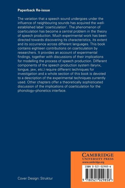 Coarticulation means the overlapping gestures that occur during the pronunciation of any sequence of speech sounds. This topic in the science of phonetics provides a challenge to speech production theory as well as to various projects in the field of speech technology, including that of building a natural sounding speech synthesizer. The eighteen chapters in this book cover the experimental techniques used for investigating the phenomenon, the experimental findings to date, and the theoretical background.