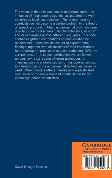 Coarticulation means the overlapping gestures that occur during the pronunciation of any sequence of speech sounds. This topic in the science of phonetics provides a challenge to speech production theory as well as to various projects in the field of speech technology, including that of building a natural sounding speech synthesizer. The eighteen chapters in this book cover the experimental techniques used for investigating the phenomenon, the experimental findings to date, and the theoretical background.