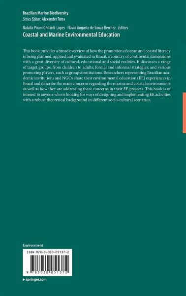1. Introduction: Marine Environmental Education: Challenges and Possibilities.- 2. Marine Environmental Education Projects in Brazil.- 3. The Importance of "Ocean literacy" in the Anthropocene.- 4. Linking Ecologic and Social Monitoring towards Earth Stewardship.- 5. Interdisciplinary and Transdisciplinary Approaches for Marine Environmental Education.- 6. Marine Environmental Education and Climate Change.- 7. Environmental Education and Conservation in Brazilian Marine Protected Areas (MPAs).- 8. Recreational and Educational Materials as a Way to Promote Marine Environmental Education.- 9. Using Different Medias as Vehicles for Marine Environmental Education.- 10. Evaluation of Environmental Education Activities.