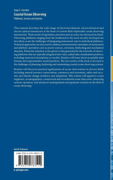This manual describes the wide range of electromechanical, electrochemical and electro-optical transducers at the heart of current field-deployable ocean observing instruments. Their modes of operation, precision and accuracy are discussed in detail. Observing platforms ranging from the traditional to the most recently developed are described, as are the challenges of integrating instrument suits to individual platforms. Technical approaches are discussed to address environmental constraints on instrument and platform operation such as power sources, corrosion, biofouling and mechanical abrasion. Particular attention is also given to data generated by the networks of observing platforms that are typically integrated into value-added data visualization products, including numerical simulations or models. Readers will learn about acceptable data formats and representative model products. The last section of the book is devoted to the challenges of planning, deploying and maintaining coastal ocean observing systems.