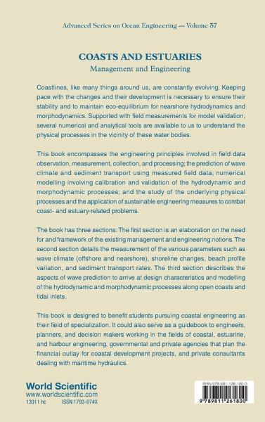 Coastlines, like many things around us, are constantly evolving. Keeping pace with the changes and their development is necessary to ensure their stability and to maintain eco-equilibrium for nearshore hydrodynamics and morphodynamics. Supported with field measurements for model validation, several numerical and analytical tools are available to us to understand the physical processes in the vicinity of these water bodies. This book encompasses the engineering principles involved in field data observation, measurement, collection, and processing; the prediction of wave climate and sediment transport using measured field data; numerical modelling involving calibration and validation of the hydrodynamic and morphodynamic processes; and the study of the underlying physical processes and the application of sustainable engineering measures to combat coast- and estuary-related problems. The book has three sections: The first section is an elaboration on the need for and framework of the existing management and engineering notions. The second section details the measurement of the various parameters such as wave climate (offshore and nearshore), shoreline changes, beach profile variation, and sediment transport rates. The third section describes the aspects of wave prediction to arrive at design characteristics and modelling of the hydrodynamic and morphodynamic processes along open coasts and tidal inlets. This book is designed to benefit students pursuing coastal engineering as their field of specialization. It could also serve as a guidebook to engineers, planners, and decision makers working in the fields of coastal, estuarine, and harbour engineering, governmental and private agencies that plan the financial outlay for coastal development projects, and private consultants dealing with maritime hydraulics.