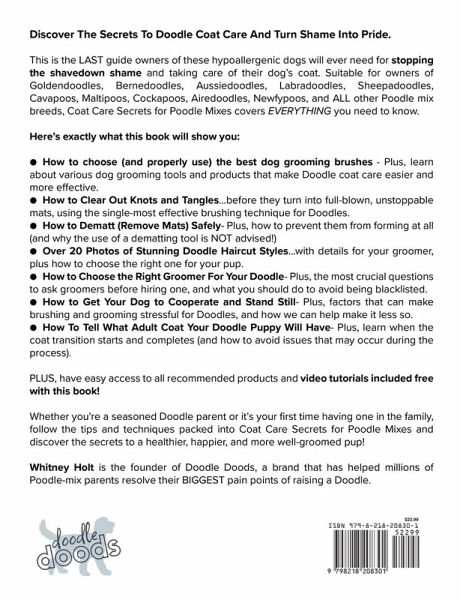 Discover The Secrets To Doodle Coat Care And Turn Shame Into Pride. This is the LAST guide owners of these hypoallergenic dogs will ever need for stopping the shavedown shame and taking care of their dog's coat. Suitable for owners of Goldendoodles, Bernedoodles, Aussiedoodles, Labradoodles, Sheepadoodles, Cavapoos, Maltipoos, Cockapoos, Airedoodles, Newfypoos, and ALL other Poodle mix breeds, Coat Care Secrets for Poodle Mixes covers EVERYTHING you need to know. Here's exactly what this book will show you: ¿How to Choose (and Properly Use) the Best Dog Grooming Brushes¿- Plus, learn about various dog grooming tools and products that make Doodle coat care easier and more effective. ¿How to Clear Out Knots and Tangles¿...before they turn into full-blown, unstoppable mats, using the single-most effective brushing technique for Doodles. ¿How to Dematt (Remove Mats) Safely¿- Plus, how to prevent them from forming at all (and why the use of a dematting tool is NOT advised!) ¿Over 20 Photos of Stunning Doodle Haircut Styles¿...with details for your groomer, plus how to choose the right one for your pup. ¿How to Choose the Right Groomer For Your Doodle¿- Plus, the most crucial questions to ask groomers before hiring one, and what you should do to avoid being blacklisted. ¿How to Get Your Dog to Cooperate and Stand Still¿- Plus, factors that can make brushing and grooming stressful for Doodles, and how we can help make it less so. ¿How To Tell What Adult Coat Your Doodle Puppy Will Have¿- Plus, learn when the coat transition starts and completes (and how to avoid issues that may occur during the process). PLUS, have easy access to all recommended products and video tutorials included free with this book! Whether you're a seasoned Doodle parent or it's your first time having one in the family, follow the tips and techniques packed into Coat Care Secrets for Poodle Mixes and discover the secrets to a healthier, happier, and more well-groomed pup!