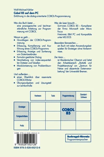 1 Grundlagen.- 1.1 Aufgabenstellung "Datenerfassung" (AUF1).- 1.2 Datensatz.- 1.3 Datenfeld und Bezeichner.- 1.4 Datenfeld-Beschreibung.- 1.5 Datensatz-Beschreibung.- 1.6 Datei-Beschreibung.- 1.7 Pufferbereiche für die Datei-Verarbeitung.- 1.8 Programm-Aufbau.- 1.9 Verbale Beschreibung der Lösung von AUF1.- 1.10 Felder der WORKING-STORAGE SECTION.- 1.11 Struktogramm zur Lösung von AUF1.- 1.12 Grundlegende COBOL-Anweisungen.- 1.13 Umformung des Struktogramms in die PROCEDURE DIVISION.- 1.14 Das COBOL-Programm "prog1" als Lösung von AUF1.- 1.15 Aufbau einer sequentiellen Ausgabe-Datei.- 1.16 Aufgaben.- 2 Ausführung eines COBOL-Programms.- 2.1 Vorbereitungen zur Programmausführung.- 2.2 Kompilierung und Programmausführung.- 3 Anzeige von Datenbeständen.- 3.1 Verarbeitung einer sequentiellen Eingabe-Datei.- 3.2 Vorbereitungen für die Bildschirmanzeige.- 3.3 Beschreibende Programmteile von "prog2".- 3.4 Struktogramm zur Lösung von AUF2.- 3.5 Prozedur- und Case-Block.- 3.6 Ausführung von Rechenoperationen.- 3.7 PROCEDURE DIVISION von "prog2".- 3.8 Aufgaben.- 4 Formular-gestützter Dialog.- 4.1 Erfassung mit einem Bildschirmformular.- 4.2 Vereinbarung eines Bildschirmformulars.- 4.3 Anzeige des Bildschirmformulars durch die DISPLAY-Anweisung.- 4.4 Vorbereitungen für die Eingabe in die Erfassungsfelder.- 4.5 Dateneingabe mit der ACCEPT-Anweisung.- 4.6 Eingabe von Werten.- 4.7 Aufgabenstellung "Formular-gestützte Erfassung" (AUF3).- 4.8 Gezielte Positionierung des Cursors.- 4.9 Änderung der Voreinstellung.- 4.10 Aufgabenstellung "Formularaufbau durch die SCREEN SECTION" (AUF4).- 4.11 Aufgaben.- 5 Sortierung von Datenbeständen.- 5.1 Vereinbarung von Sortierschlüsseln.- 5.2 Sortierung.- 5.4 Mischen von sortierten Datensätzen.- 5.5Aufgaben.- 6 Verarbeitung von index-sequentiellen Dateien.- 6.1 Aufbau einer index-sequentiellen Datei.- 6.2 Sequentieller Zugriff auf den Satzbestand.- 6.3 Gezielter Zugriff auf den Satzbestand.- 6.4 Dynamischer Zugriff auf den Satzbestand.- 6.5 Zugriff über Alternativschlüssel.- 6.6 Aufgaben.- 7 Vereinbarung und Verarbeitung von Tabellen.- 7.1 Definition und Zugriff auf Tabellen.- 7.2 Lineares Durchsuchen von Tabellen.- 7.3 Logarithmisches Durchsuchen von Tabellen.- 7.4 Das Arbeiten mit mehrstufigen Tabellen.- 7.5 Aufgaben.- 8 Modularisierung von Problemlösungen.- 8.1 Struktur von Unterprogrammen.- 8.2 Aufgabenstellung "Mehrere Programmeinheiten" (AUF13).- 8.3 Beschreibende Programmteile des Hauptprogramms "prog13".- 8.4 Unterprogrammaufruf und Rücksprung.- 8.5 Struktogramm zur Lösung von AUF13.- 8.6 PROCEDURE DIVISION von "prog13".- 8.7 Unterprogramme "prog7a" und "prog8a".- 8.8 Parameterübergabe.- 8.9 Aufgabenstellung "Verschachtelter Aufruf" (AUF14).- 8.10 Das Hauptprogramm "prog14".- 8.11 Das Unterprogramm "prog14a".- 8.12 Speicherplatzmangel.- 8.13 Aufgaben.- A.1 Reservierte COBOL-Wörter.- Lösungsteil.