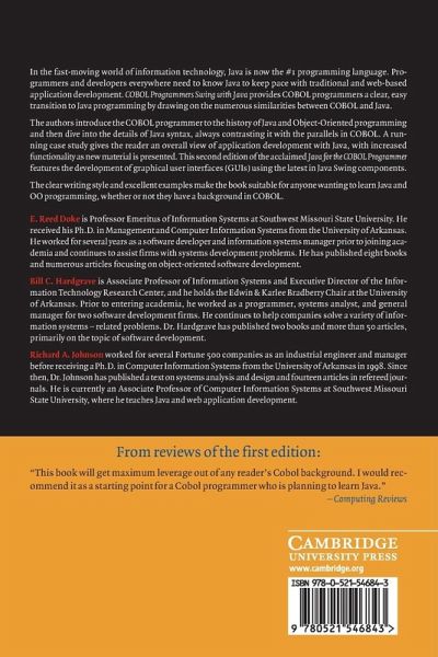 In the fast moving world of information technology, Java is now the number 1 programming language. Programmers and developers everywhere need to know Java to keep pace with traditional and web-based application development. COBOL Programmers Swing with Java provides COBOL programmers a clear, easy transition to Java programming by drawing on the numerous similarities between COBOL and Java. The authors introduce the COBOL programmer to the history of Java and object-oriented programming and then dive into the details of the Java syntax, always contrasting them with their parallels in COBOL. A running case study gives the reader an overall view of application development with Java, with increased functionality as new material is presented. This new edition features the development of graphical user interfaces (GUI's) using the latest in Java Swing components. The clear writing style and excellent examples make the book suitable for anyone wanting to learn Java and OO programming, whether they have a background in COBOL or not.