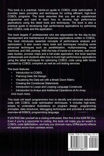 This book is a practical, hands-on guide to COBOL code optimization. It provides basic principles and techniques for writing efficient, high-level COBOL programs. The book assumes that you are an experienced programmer and want to learn how to develop high performance applications using the latest tools and techniques. The book is also a practical guide to developing high performance applications by optimizing both COBOL code and the application. The book targets IT professionals who are responsible for the day-to-day development and maintenance of business applications written in COBOL. The book introduces essential concepts of performance analysis and optimization. It also covers many tools and techniques including some advanced techniques such as parallelization, multiprocessing, virtual machines, and XML parsing. With the help of hands-on examples, real world case studies, process maps and a full-scale application, this book teaches professionals and students alike how to build high performance applications using the latest techniques for optimizing COBOL code using safe hooks provided by COBOL compilers as well as unit testing services. The book features: · Introduction to COBOL · Planning data set design · Visualizing the data set with a break down matrix · Creating the conditional statements · Introduction to loops and looping language constructs · Introduction to arrays and additional operations of an array And much more. This book will teach programmers how to identify and eliminate redundant code with COBOL code optimization techniques. It includes high-level, simple to understand illustrations on program design, programming principles, data structures, debugging techniques and provides a complete overview of COBOL programming language. If you truly see yourself as a coding enthusiast, then this is the book for you. Even if you're a newcomer to coding, this book will make you an expert in COBOL code optimization, and help you diminish many of the painful effects of repeated errors from careless errors.