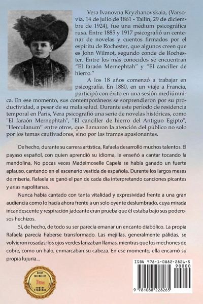 De hecho, durante su carrera artística, Rafaela desarrolló muchos talentos. El payaso español, con quien aprendió su idioma, le enseñó a cantar tocando la mandolina. No pocas veces Madeimoselle Capela se había ganado un fuerte aplauso, cantando en el escenario vestida de española. Durante los largos meses de miseria, Rafaela se ganó el pan de cada día interpretando canciones picantes y arias napolitanas. Nunca había cantado con tanta vitalidad y expresividad frente a una gran audiencia como lo hacía ahora frente a un solo oyente deslumbrado, cuya mirada incandescente y respiración jadeante eran prueba que él estaba bajo sus poderosos hechizos. Sí, de hecho, de todo su ser parecía emanar un encanto diabólico. La propia Rafaela parecía haberse transformado. Las mejillas, generalmente pálidas, se volvieron rosadas; los ojos verdes lanzaban llamas, mientras que los mechones de cobre, como un halo, enmarcaban su cabeza. En ese momento, ella encarnó su propia lujuria..."