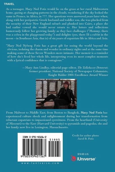As a teenager, Mary Ned Fotis would lie on the grass at her rural Midwestern home, gazing at changing patterns in the clouds, wondering if the sky looked the same in France, in Africa, in ???. Her questions were answered years later when, along with her peripatetic Greek husband and toddler son, she was plucked from the security of their New England suburb and plunked into Cairo, a place she had earlier vowed she would never return to. Her letters and reflections humorously follow her growing family as they face challenges ("Mommy, there was a cobra in the playground today") and delights (yes, there IS a rabbit in the moon-in Southeast Asia, that is) of six years of expatriate life in Africa and Asia. "Mary Ned Nyberg Fotis has a great gift for seeing the world beyond the obvious, isolating the charm and wonder in ordinary sights and at the same time making some of those Seven Wonders more intimate. Her memoir is a reminder of how she's lived her whole life, interpreting even its most complex moments with a lyrical confidence that is contagious." -Mary Ann Lindley, editorial page editor, The Tallahassee Democrat; former president, National Society of Newspaper Columnists, Knight Ridder 2005 Excellence Award Winner