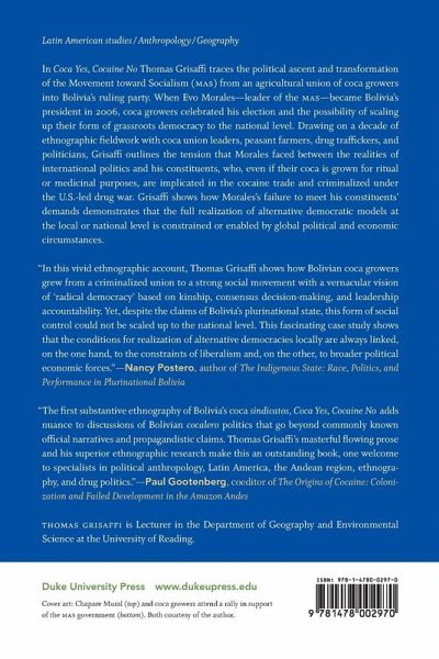 In Coca Yes, Cocaine No Thomas Grisaffi traces the political ascent and transformation of the Movement toward Socialism (MAS) from an agricultural union of coca growers into Bolivia's ruling party. When Evo Morales-leader of the MAS-became Bolivia's president in 2006, coca growers celebrated his election and the possibility of scaling up their form of grassroots democracy to the national level. Drawing on a decade of ethnographic fieldwork with coca union leaders, peasant farmers, drug traffickers, and politicians, Grisaffi outlines the tension that Morales faced between the realities of international politics and his constituents, who, even if their coca is grown for ritual or medicinal purposes, are implicated in the cocaine trade and criminalized under the U.S.-led drug war. Grisaffi shows how Morales's failure to meet his constituents' demands demonstrates that the full realization of alternative democratic models at the local or national level is constrained or enabled by global political and economic circumstances.