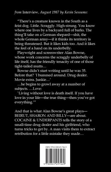 from Interview, August 1987 by Kevin Sessums: "There's a creature known in the South as a feist dog. Little. Scraggly. High-strung. You know where one lives by a backyard full of barks. The thing'll take on a German shepard-shit, the whole German army-if it thinks its territory is being threatened. But it likes kids too. And it likes the feel of a hand on its underbelly. Playwright and screenwriter Alan Bowne, whose work concerns the scraggly underbelly of life itself, has the friendly tenacity of one of those tight-tailed mutts… Bowne didn't start writing until he was 35. Before that? 'I bummed around. Drug dealer. Movie extra. Junkie…' …he begins to growl away at a number of subjects. …Love: 'Living without love is death itself. If you have love in your life-the true thing-then you've got everything.'" And that is what Alan Bowne's great plays-BEIRUT, SHARON AND BILLY-are about. COCAINE & UNDERPANTS tells the story of a small-time drug dealer and his girlfriend, who turns tricks to get by. A man visits them to extract retribution for a little mistake they made…