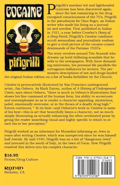 Cocaine is the story of a young man who runs off to Paris to seek fame, fortune, and fun. Pitigrilli's classic novel charts the comedy and pathos of a young man's tragic trajectory. Tito Arnaudi is a dandified hero with several mistresses he juggles. A failed medical student, Tito is hired as a journalist in Paris, where he investigates cocaine dens and invents lurid scandals and gruesome deaths that he sells to newspapers as his own life becomes more outrageous than his phony press reports. Telling of orgies and strawberries soaked in champagne and ether, Tito lives with intensity as he pursues his Italian girlfriend Maud (née Maddalena) and wealthy Armenian Kalantan, who insists on making love in a black coffin. Provocatively illustrated, filled with lush, intoxicating prose, Cocaine is a wicked novel about the Lost Generation in 1920s Paris. Dizzy and decadent, Pitigrilli leaves nothing unexplored as he presents astonishing descriptions of upper class debauching - strawberries and chloroform, naked dancing, cocaine aplenty, and guests openly injecting morphine. Despite its wit, Cocaine is a sobering account of the dangers of drugs and sexual obsession. Tito happily trades in his twilight years for moments of wicked ecstasy.