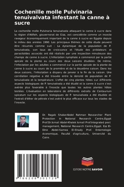 La cochenille molle Pulvinaria tenuivalvata attaquant la canne à sucre dans la région d'Attfieh, gouvernorat de Giza, est considérée comme un insecte ravageur économiquement important de la canne à sucre en Egypte depuis le milieu des années 1990. Les principaux thèmes de cette étude peuvent être résumés comme suit : La dynamique de la population de P. tenuivalvata, son taux de croissance et l'étude des prédateurs et parasitoïdes associés ont été réalisés par une inspection minutieuse des champs de canne à sucre. L'infestation nymphale a commencé par la partie apicale de la plante au cours des deux saisons étudiées. De même, l'infestation par les adultes a commencé sur la partie apicale de la plante de canne à sucre au cours de la première et de la deuxième saison. Dans les deux saisons, l'infestation a disparu de janvier à la fin de la saison. Une corrélation négative a été trouvée entre la densité de population de P. tenuivalvata et la température. L'effet de cinq plantes hôtes sur différents aspects biologiques de P. tenuivalvata a été étudié et la canne à sucre s'est avérée plus favorable à l'insecte que toutes les autres plantes hôtes testées. L'évaluation en laboratoire de différents extraits de Centaurium spicatum sur les aspects biologiques de P. tenuivalvata a été étudiée et l'extrait d'éther de pétrole s'est avéré le plus efficace sur tous les stades de l'insecte.