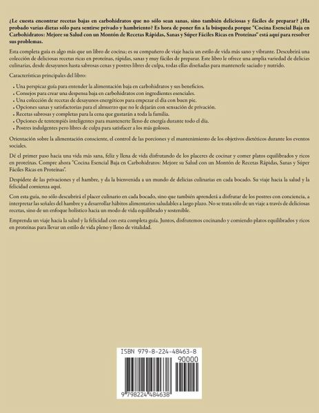 ¿Le cuesta encontrar recetas bajas en carbohidratos que no sólo sean sanas, sino también deliciosas y fáciles de preparar? ¿Ha probado varias dietas sólo para sentirse privado y hambriento? Es hora de poner fin a la búsqueda porque "Cocina Esencial Baja en Carbohidratos: Mejore su Salud con un Montón de Recetas Rápidas, Sanas y Súper Fáciles Ricas en Proteínas" está aquí para resolver sus problemas. Esta completa guía es algo más que un libro de cocina; es su compañero de viaje hacia un estilo de vida más sano y vibrante. Descubrirá una colección de deliciosas recetas ricas en proteínas, rápidas, sanas y muy fáciles de preparar. Este libro le ofrece una amplia variedad de delicias culinarias, desde desayunos hasta sabrosas cenas y postres libres de culpa, todas ellas diseñadas para mantenerle saciado y nutrido. Características principales del libro:Una perspicaz guía para entender la alimentación baja en carbohidratos y sus beneficios. Consejos para crear una despensa baja en carbohidratos con ingredientes esenciales. Una colección de recetas de desayunos energéticos para empezar el día con buen pie. Opciones sanas y satisfactorias para el almuerzo que no le dejarán con sensación de privación. Recetas sabrosas y completas para la cena que gustarán a toda la familia. Opciones de tentempiés inteligentes para mantenerte lleno de energía durante todo el día. Postres indulgentes pero libres de culpa para satisfacer a los más golosos. Orientación sobre la alimentación consciente, el control de las porciones y el mantenimiento de los objetivos dietéticos durante los eventos sociales. Dé el primer paso hacia una vida más sana, feliz y llena de vida disfrutando de los placeres de cocinar y comer platos equilibrados y ricos en proteínas. Compre ahora "Cocina Esencial Baja en Carbohidratos: Mejore su Salud con un Montón de Recetas Rápidas, Sanas y Súper Fáciles Ricas en Proteínas". Despídete de las privaciones y el hambre, y da la bienvenida a un mundo de delicias culinarias en cada bocado. Su viaje hacia la salud y la felicidad comienza aquí. Con esta guía, no sólo descubrirá el placer culinario en cada bocado, sino que también aprenderá a disfrutar de los postres con conciencia, a interpretar las señales del hambre y a desarrollar hábitos alimentarios saludables a largo plazo. No se trata sólo de un viaje a través de deliciosas recetas, sino de un enfoque holístico hacia un modo de vida equilibrado y sostenible. Emprenda un viaje hacia la salud y la felicidad con esta completa guía. Juntos, disfrutemos cocinando y comiendo platos equilibrados y ricos en proteínas para llevar un estilo de vida pleno y lleno de vitalidad.