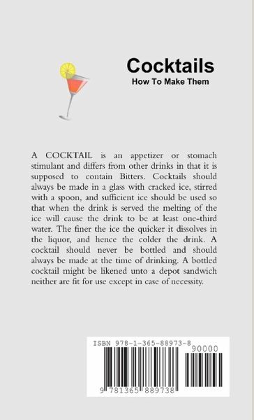 An insightful book of Forty eight cocktail recipes and how to make them. A COCKTAIL is an appetizer or stomach stimulant and differs from other drinks in that it is supposed to contain Bitters. Cocktails should always be made in a glass with cracked ice, stirred with a spoon, and sufficient ice should be used so that when the drink is served the melting of the ice will cause the drink to be at least one-third water. The finer the ice the quicker it dissolves in the liquor, and hence the colder the drink. A cocktail should never be bottled and should always be made at the time of drinking. A bottled cocktail might be likened unto a depot sandwich¿neither are fit for use except in case of necessity.