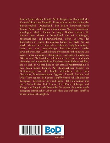 Fast drei Jahre lebt die Familie Adt in Bangui, der Hauptstadt der Zentralafrikanischen Republik. Harro Adt ist dort Botschafter der Bundesrepublik Deutschland. Die beiden heranwachsenden Kinder Katrin und Florian müssen ihren Weg in französisch-sprachigen Schulen finden. In langen Briefen berichtet die Autorin ihrer Mutter in Deutschland vom oft schwierigen, abenteuerlichen und ungewöhnlichen Leben als Frau des Botschafters in einem der ärmsten Länder der Welt. Sie hat wieder einmal ihren Beruf als Apothekerin aufgeben müssen; muss nun eine vernachlässigte Botschaftsresidenz wieder bewohnbar machen; Cocktails und Festessen für oft hunderte von Gästen unter einfachsten Bedingungen ausrichten; Hausdiener, Gärtner und Nachtwächter anleiten und betreuen - und auch vielseitige und ungewöhnliche Repräsentationspflichten erfüllen, die sie auch im Cocktailkleid in der Transall-Militärmaschine in den Busch führen können. Auf abenteuerlichen Fahrten im Geländewagen lernt die Familie afrikanische Dörfer ihres Gastlandes, Missionsstationen, Pygmäen, Urwald, Savanne und wilde Tiere kennen. Mit einem Schiffsverband voll afrikanischer Passagiere - Menschen, Tiere und Fische - fährt die Autorin mit ihrem Sohn Florian 1200 km auf den Flüssen Oubangui und Kongo von Bangui nach Brazzaville. Sie erleben als einzige weiße Passagiere afrikanisches Leben am Fluss und auf dem Schiff in seiner ganzen Lebendigkeit.
