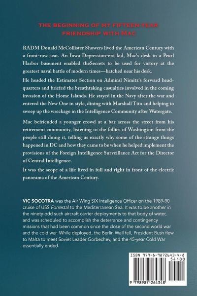 The beginning of my fifteen-year friendship with Mac-RADM Donald McCollister Showers lived the American Century with a front-row seat. An Iowa Depression-era kid, Mac's desk in a Pearl Harbor basement enabled the Secrets to be used for victory at the greatest naval battle of modern times-hatched near his desk. He headed the Estimates Section on Admiral Nimitz's forward head- quarters and briefed the breathtaking casualties involved in the coming invasion of the Home Islands. He stayed in the Navy after the war and entered the New One in style, dining with Marshall Tito and helping to sweep up the wreckage in the Intelligence Community after Watergate. Mac befriended a younger crowd at a bar across the street from his retirement community, listening to the follies of Washington from the people still doing it, telling us exactly why some of the strange things happened in DC and how they came to be when he helped implement the provisions of the Foreign Intelligence Surveillance Act for the Director of Central Intelligence. It was the scope of a life lived in full and right in front of the electric panorama of the American Century.