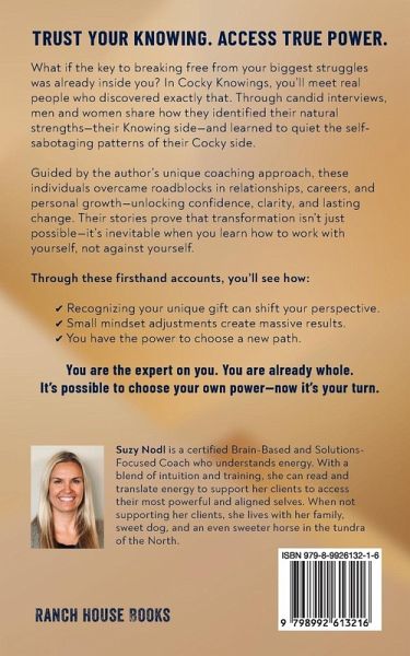 TRUST YOUR KNOWING. ACCESS TRUE POWER. What if the key to breaking free from your biggest struggles was already inside you? In Cocky Knowings, you'll meet real people who discovered exactly that. Through candid interviews, men and women share how they identified their natural strengths-their Knowing side-and learned to quiet the self-sabotaging patterns of their Cocky side. Guided by the author's unique coaching approach, these individuals overcame roadblocks in relationships, careers, and personal growth-unlocking confidence, clarity, and lasting change. Their stories prove that transformation isn't just possible-it's inevitable when you learn how to work with yourself, not against yourself. Through these firsthand accounts, you'll see how:Recognizing your unique gift can shift your perspective. Small mindset adjustments create massive results. You have the power to choose a new path. Suzy Nodl is a certified Brain-Based and Solutions-Focused Coach who understands energy. With a blend of intuition and training, she can read and translate energy to support her clients to access their most powerful and aligned selves. When not supporting her clients, she lives with her family, sweet dog, and an even sweeter horse in the tundra of the North.