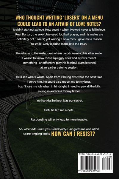 Who thought writing ‘LOSERS’ on a menu could lead to an affair of love notes? It didn’t start out as love. How could it when I vowed never to fall in love. Reef Burton, the sexy blue-eyed football player, and his mates are definitely not ‘Losers’, yet writing it on a menu gave me a reason to smile. Only it didn’t make it to the trash. He returns to the restaurant where I work wearing his killer smile. I wasn’t to know those squiggly lines and arrows meant something—an offensive play his football team learned at an earlier training session. He’ll see what I wrote. Apart from it being awkward the next time I serve him, he could also report me to my boss. I can’t lose my job when in hindsight, I need to pay all the bills rolling in and care for my father. I’m thankful he kept it as our secret. Until he left me a note. Responding will only lead to more trouble. So, when Mr Blue Eyes-Blond Surfy-Hair gives me one of his spine-tingling looks, how can I resist?