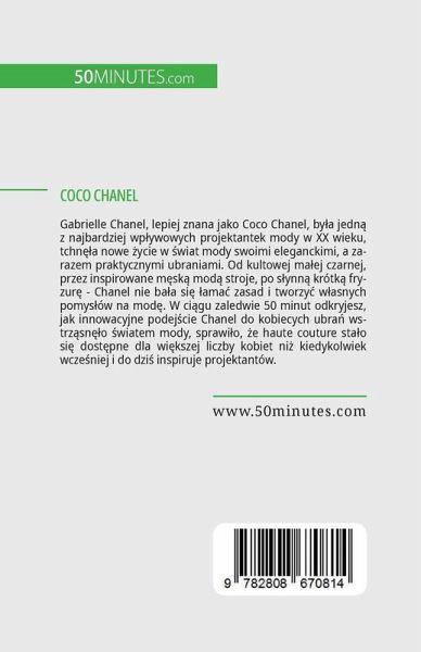 Gabrielle Chanel, lepiej znana jako Coco Chanel, by¿a jedn¿ z najbardziej wp¿ywowych projektantek mody w XX wieku, tchn¿¿a nowe ¿ycie w ¿wiat mody swoimi eleganckimi, a zarazem praktycznymi ubraniami. Od kultowej mäej czarnej, przez inspirowane m¿sk¿ mod¿ stroje, po s¿ynn¿ krótk¿ fryzur¿ - Chanel nie bäa si¿ ¿amä zasad i tworzy¿ w¿asnych pomys¿ów na mod¿. W ci¿gu zaledwie 50 minut odkryjesz, jak innowacyjne podej¿cie Chanel do kobiecych ubrä wstrz¿sn¿¿o ¿wiatem mody, sprawi¿o, ¿e haute couture stäo si¿ dost¿pne dla wi¿kszej liczby kobiet ni¿ kiedykolwiek wcze¿niej i do dzi¿ inspiruje projektantów. Ta prosta i pouczaj¿ca ksi¿¿ka oferuje dok¿adne omówienie kluczowych momentów w trwaj¿cej kilkadziesi¿t lat karierze Chanel, w tym otwarcia jej pierwszego sklepu, Chanel Modes, wprowadzenia na rynek kultowych perfum Chanel No. 5 oraz jej wspó¿pracy z nazistami podczas II wojny ¿wiatowej. Zawiera tak¿e pe¿n¿ biografi¿, cenne wprowadzenie do kontekstu politycznego, spo¿ecznego i ekonomicznego oraz ocen¿ wp¿ywu twórczo¿ci Chanel, daj¿c ci wszystkie niezb¿dne informacje o tej ikonie ¿wiata mody.
