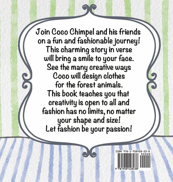 Join Coco Chimpel and his friends on a fun and fashionable journey! This charming story in verse will bring a smile to your face. See the many creative ways Coco will design clothes for the forest animals. This book teaches you that creativity is open to all and fashion has no limits, no matter your shape and size! Let fashion be your passion!