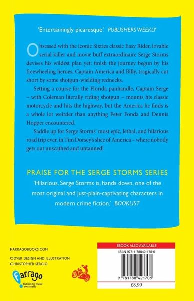 Obsessed with the iconic Sixties classic Easy Rider, lovable serial killer and movie buff extraordinaire Serge A. Storms devises his wildest plan yet: finish the journey begun by his freewheeling heroes, Captain America and Billy, tragically cut short by some shotgun-wielding rednecks. Setting a course for the Florida panhandle, Captain Serge - with Coleman literally riding shotgun - mounts his classic motorcycle and hits the highway, but the America he finds is a whole lot weirder than anything Peter Fonda and Dennis Hopper encountered. In a state where criminal politicians are more common than gators, Serge and Coleman discover one particular speed-trap locale so aggressively inept at corruption that investigators are baffled where to start. Saddle up for Serge Storms' most epic, lethal, and hilarious road trip ever, in Tim Dorsey's slice of America - where nobody gets out unscathed and untanned!