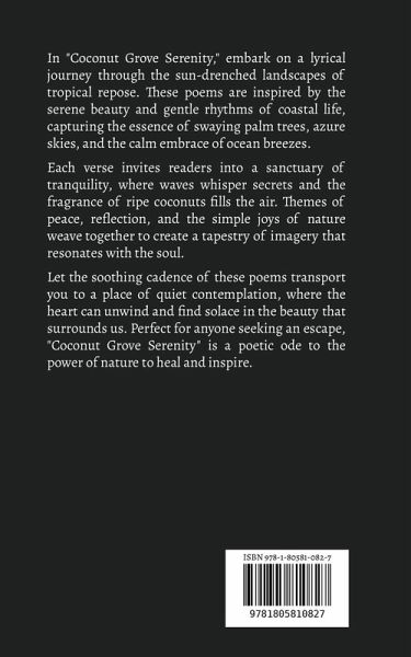 In "Coconut Grove Serenity," embark on a lyrical journey through the sun-drenched landscapes of tropical repose. These poems are inspired by the serene beauty and gentle rhythms of coastal life, capturing the essence of swaying palm trees, azure skies, and the calm embrace of ocean breezes. Each verse invites readers into a sanctuary of tranquility, where waves whisper secrets and the fragrance of ripe coconuts fills the air. Themes of peace, reflection, and the simple joys of nature weave together to create a tapestry of imagery that resonates with the soul. Let the soothing cadence of these poems transport you to a place of quiet contemplation, where the heart can unwind and find solace in the beauty that surrounds us. Perfect for anyone seeking an escape, "Coconut Grove Serenity" is a poetic ode to the power of nature to heal and inspire.