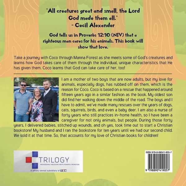 "All creatures great and small, the Lord God made them all." - Cecil Alexander God tells us in Proverbs 12:10 (NIV) that a righteous man cares for his animals. This book will show that love. Take a journey with Coco through Manna Forest as she meets some of God's creatures and learns how God takes care of them through the individual, unique characteristics that He has given them. Coco learns that God can take care of her, too!