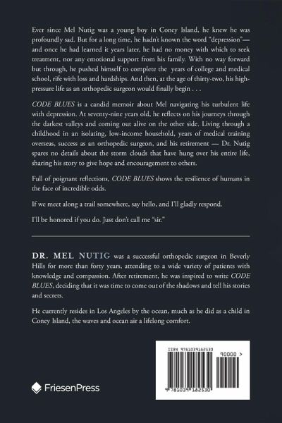 Ever since Mel Nutig was a young boy in Coney Island, he knew he was profoundly sad. But for a long time, he hadn't known the word "depression"- and once he had learned it years later, he had no money with which to seek treatment, nor any emotional support from his family. With no way forward but through, he pushed himself to complete the years of college and medical school, rife with loss and hardships. And then, at the age of thirty-two, his high pressure life as an orthopedic surgeon would finally begin... CODE BLUES is a candid memoir about Mel navigating his turbulent life with depression. At seventy-nine years old, he reflects on his journeys through the darkest valleys and coming out alive on the other side. Living through a childhood in an isolating, low-income household, years of medical training overseas, success as an orthopedic surgeon, and his retirement - Dr. Nutig spares no details about the storm clouds that have hung over his entire life, sharing his story to give hope and encouragement to others. Full of poignant reflections, CODE BLUES shows the resilience of humans in the face of incredible odds. If we meet along a trail somewhere, say hello, and I'll gladly respond. I'll be honored if you do. Just don't call me "sir."