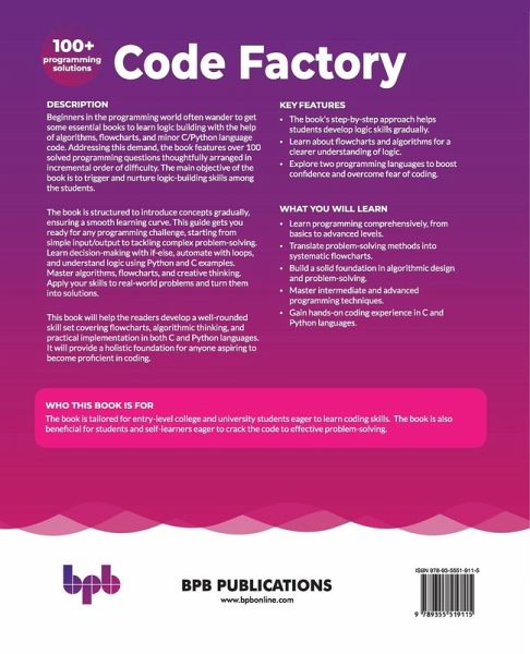Where algorithms dance and ideas ignite: Welcome to the rhythm of the code DESCRIPTION Beginners in the programming world often wander to get some essential books to learn logic building with the help of algorithms, flowcharts, and minor C/Python language code. Addressing this demand, the book features over 100 solved programming questions thoughtfully arranged in incremental order of difficulty. The main objective of the book is to trigger and nurture logic-building skills among the students. The book is structured to introduce concepts gradually, ensuring a smooth learning curve. This guide gets you ready for any programming challenge, starting from simple input/output to tackling complex problem-solving. Learn decision-making with if-else, automate with loops, and understand logic using Python and C examples. Master algorithms, flowcharts, and creative thinking. Apply your skills to real-world problems and turn them into solutions. This book will help the readers develop a well-rounded skill set covering flowcharts, algorithmic thinking, and practical implementation in both C and Python languages. It will provide a holistic foundation for anyone aspiring to become proficient in coding. WHAT YOU WILL LEARN ¿ Learn programming comprehensively, from basics to advanced levels. ¿ Translate problem-solving methods into systematic flowcharts. ¿ Build a solid foundation in algorithmic design and problem-solving. ¿ Master intermediate and advanced programming techniques. ¿ Gain hands-on coding experience in C and Python languages. WHO THIS BOOK IS FOR The book is tailored for entry-level college and university students eager to learn coding skills. The book is also beneficial for students and self-learners eager to crack the code to effective problem-solving.