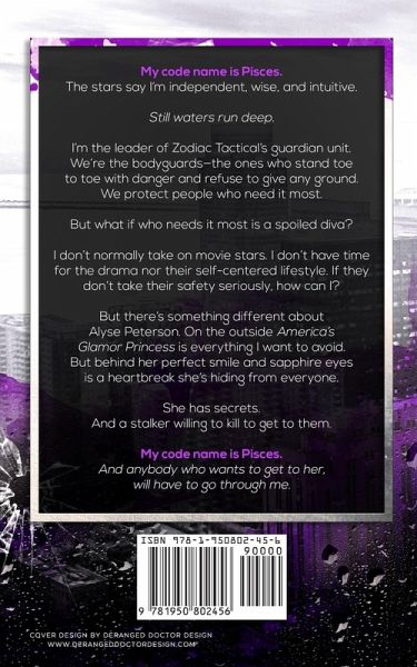 (3rd Person POV edition) ¿Tristan Zimmerman. Zodiac Tactical code name: Pisces. Independent, wise, and intuitive-still waters run deep. He's the leader of Zodiac Tactical's guardian unit. They're the bodyguards-the ones who stand toe to toe with danger and refuse to give any ground. They protect people who need it most. But what if who needs it most is a spoiled diva? Tristan doesn't normally take on movie stars. He doesn't have time for the drama nor their self-centered lifestyle. If they don't take their own safety seriously, how can he? But there's something different about Alyse Peterson. On the outside America's Glamor Princess is everything he wants to avoid. But behind her perfect smile and sapphire eyes is a heartbreak she's hiding from everyone. She has secrets. And a stalker willing to kill to get to them. His code name is Pisces. And anybody who wants to get to her, will have to go through him.