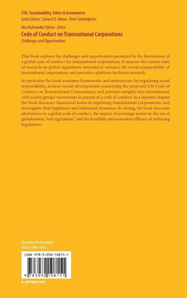 In particular the book examines frameworks and instruments for regulating social responsibility, reviews recent developments concerning the proposed UN Code of Conduct on Transnational Corporations, and provides insights into international civil society groups' movements in pursuit of a code of conduct. In a separate chapter the book discusses theoretical issues in regulating transnational corporations, and investigates their legitimacy and behavioral dynamics. In closing, the book discusses alternatives to a global code of conduct, the impact of sovereign power in the era of globalization, "soft regulations," and the feasibility and normative efficacyof enforcing regulations.