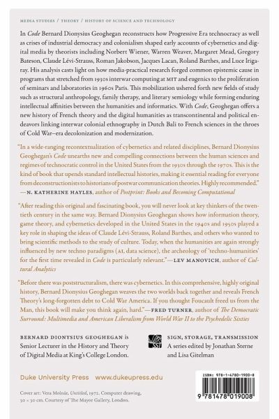 In Code Bernard Dionysius Geoghegan reconstructs how Progressive Era technocracy as well as crises of industrial democracy and colonialism shaped early accounts of cybernetics and digital media by theorists including Norbert Wiener, Warren Weaver, Margaret Mead, Gregory Bateson, Claude Lévi-Strauss, Roman Jakobson, Jacques Lacan, Roland Barthes, and Luce Irigaray. His analysis casts light on how media-practical research forged common epistemic cause in programs that stretched from 1930s interwar computing at MIT and eugenics to the proliferation of seminars and laboratories in 1960s Paris. This mobilization ushered forth new fields of study such as structural anthropology, family therapy, and literary semiology while forming enduring intellectual affinities between the humanities and informatics. With Code, Geoghegan offers a new history of French theory and the digital humanities as transcontinental and political endeavors linking interwar colonial ethnography in Dutch Bali to French sciences in the throes of Cold War-era decolonization and modernization.