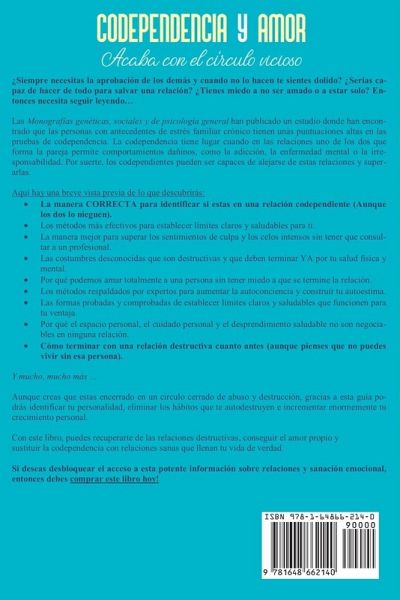 ¿Siempre necesitas la aprobación de los demás y cuando no lo hacen te sientes dolido? ¿Serias capaz de hacer de todo para salvar una relación? ¿Tienes miedo a no ser amado o a estar solo? Entonces necesita seguir leyendo... Las Monografías genéticas, sociales y de psicología general han publicado un estudio donde han encontrado que las personas con antecedentes de estrés familiar crónico tienen unas puntuaciones altas en las pruebas de codependencia. La codependencia tiene lugar cuando en las relaciones uno de los dos que forma la pareja permite comportamientos dañinos, como la adicción, la enfermedad mental o la irresponsabilidad. Por suerte, los codependientes pueden ser capaces de alejarse de estas relaciones y superarlas. Aquí hay una breve vista previa de lo que descubrirás: La manera CORRECTA para identificar si estas en una relación codependiente (Aunque los dos lo nieguen). Los métodos más efectivos para establecer límites claros y saludables para ti. La manera mejor para superar los sentimientos de culpa y los celos intensos sin tener que consultar a un profesional. Las costumbres desconocidas que son destructivas y que deben terminar YA por tu salud física y mental. Por qué podemos amar totalmente a una persona sin tener miedo a que se termine la relación. Los métodos respaldados por expertos para aumentar la autoconciencia y construir tu autoestima. Las formas probadas y comprobadas de establecer límites claros y saludables que funcionen para tu ventaja. Por qué el espacio personal, el cuidado personal y el desprendimiento saludable no son negociables en ninguna relación. Cómo terminar con una relación destructiva cuanto antes (aunque pienses que no puedes vivir sin esa persona). Y mucho, mucho más ... Aunque creas que estas encerrado en un circulo cerrado de abuso y destrucción, gracias a esta guía podrás identificar tu personalidad, eliminar los hábitos que te autodestruyen e incrementar enormemente tu crecimiento personal. Con este libro, puedes recuperarte de las relaciones destructivas, conseguir el amor propio y sustituir la codependencia con relaciones sanas que llenan tu vida de verdad. Si deseas desbloquear el acceso a esta potente información sobre relaciones y sanación emocional, entonces debes comprar este libro hoy!