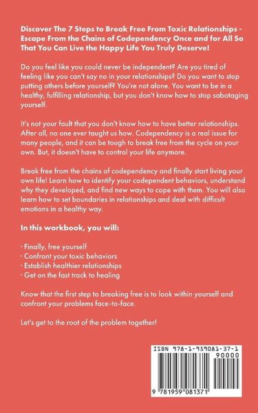 7 Steps to Break Free from the Chains of Codependency Once and for All Do you feel like you could never be independent? Are you tired of feeling like you can't say no in your relationships? Do you want to stop putting others before yourself? You're not alone. You want to be in a healthy, fulfilling relationship, but you don't know how to stop sabotaging yourself. It's not your fault that you don't know how to have better relationships. After all, no one ever taught us how. Codependency is a real issue for many people, and it can be tough to break free from the cycle on your own. But, it doesn't have to control your life anymore. Break free from the chains of codependency and finally start living your own life. Learn how to identify your codependent behaviors, understand why they developed, and find new ways to cope with them. You will also learn how to set boundaries in relationships and deal with difficult emotions in a healthy way. In this workbook, you will: ¿ Finally, free yourself: Break free from the chains of codependency and put a stop to your people pleasing. It's finally time to put yourself first. ¿ Confront your toxic behaviors: Understand how these behaviors developed and get to the root cause of the problem. ¿ Establish healthier relationships: You deserve a happy and healthy relationship after everything you've been through. And after healing, a happier and healthier relationship is what you'll find. ¿ Get on the fast track to healing: With these 7 steps, you'll be able to immediately begin your healing journey and put an end to your codependency habits. Know that the first step to breaking free is to look within yourself and confront your problems face-to-face. So if you're ready to get to the root of the problem together, then grab this book today.