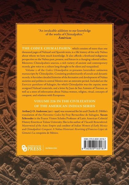 The Codex Chimalpahin, which consists of more than one thousand pages of Nahuatl and Spanish texts, is a life history of the only Nahua about whom we have much knowledge. It also affords a firsthand indigenous perspective on the Nahua past, present, and future in a changing colonial milieu. Moreover, Chimalpahin's sources, a rich variety of ancient and contemporary records, give voice to a culture long thought to be silent and vanquished. Volume Two of the Codex Chimalpahin represents heretofore-unknown manuscripts by Chimalpahin. Predominantly annals and dynastic records, it furnishes detailed histories of the formation and development of Nahua societies and polities in central Mexico over an extensive period. Included are the Exercicio quotidiano of Sahagun, for which Chimalpahin was the copyist, some unsigned Nahuatl materials, and a letter by Juan de San Antonio of Texcoco as well as a store of information about Nahua women, religion, ritual, concepts of conquest, and relations with Europeans.