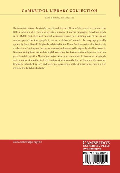 The twin sisters Agnes Lewis (1843-1926) and Margaret Gibson (1843-1920) were pioneering biblical scholars who became experts in a number of ancient languages. Travelling widely in the Middle East, they made several significant discoveries, including one of the earliest manuscripts of the four gospels in Syriac, a dialect of Aramaic, the language probably spoken by Jesus himself. Originally published in the Horae Semitica series, this fascicule is a collection of palimpsest fragments acquired and translated by Agnes Lewis. Discovered in Sinai and dating from the sixth to eighth centuries, the documents include parts of the four gospels and the epistles. Most important of the texts are an Aramaic lectionary on the gospels and a number of homilies including unique stories from the lives of Jesus and the apostles. Originally published in 1909 and featuring translations of the Aramaic texts, this is a vital resource for the biblical scholar.