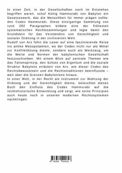 In einer Zeit, in der Gesellschaften noch im Entstehen begriffen waren, schuf König Hammurabi von Babylon ein Gesetzeswerk, das die Menschheit für immer prägen sollte: den Codex Hammurabi. Diese einzigartige Sammlung von rund 282 Paragraphen bildete eine der frühesten systematischen Rechtssammlungen und legte damit den Grundstein für das Verständnis von Gerechtigkeit und sozialer Ordnung in der zivilisierten Welt.Rudolf von Arx führt die Leser auf eine faszinierende Reise ins antike Mesopotamien, wo der Codex nicht nur als Mittel zur Konfliktlösung diente, sondern auch als Werkzeug, um die Werte und Normen der babylonischen Gesellschaft festzuschreiben. Mit einem Blick auf zentrale Themen wie das Talionsprinzip, den Schutz von Eigentum und die soziale Struktur Babylons erläutert von Arx, wie dieser Codex das Rechtsbewusstsein und die Rechtstraditionen beeinflusste - weit über die Grenzen Babyloniens hinaus.In einer Welt, in der Recht als Instrument zur Wahrung der Ordnung und derGerechtigkeit diente, beleuchtet dieses Buch den Einfluss des Codex Hammurabi auf die rechtshistorische Entwicklung und zeigt, wie seine Prinzipien auch heute noch in unseren modernen Rechtssystemen nachklingen.