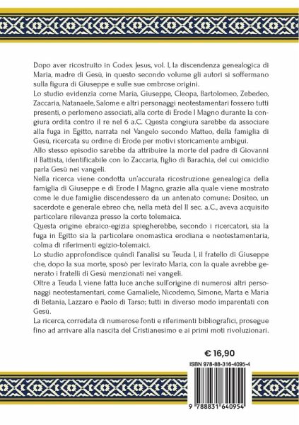 "In questo nuovo studio gli autori si soffermano sulla figura di Giuseppe e sulle sue ombrose origini. Il libro evidenzia come Maria, Giuseppe, Cleopa, Bartolomeo e altri personaggi neotestamentari fossero tutti presenti alla corte di Erode durante la congiura del 6 a.C. associata alla fuga in Egitto della famiglia di Gesù. Allo stesso episodio sarebbe da attribuire la morte del padre di Giovanni il Battista. Nella ricerca viene condotta un'accurata ricostruzione genealogica della famiglia di Giuseppe e di Erode, grazie alla quale viene mostrato come le due famiglie discendessero da un antenato comune: Dositeo, un sacerdote e generale ebreo che aveva acquisito particolare rilevanza presso la corte tolemaica. Questa origine ebraico-egizia spiegherebbe sia la fuga in Egitto sia la particolare onomastica erodiana e neotestamentaria, colma di riferimenti egizio-tolemaici. Lo studio approfondisce l'analisi su Teuda I, il fratello di Giuseppe che, dopo la sua morte, sposò per levirato Maria, con la quale avrebbe generato i fratelli di Gesù menzionati nei vangeli. Oltre a Teuda I, viene fatta luce anche sull'origine di numerosi altri personaggi neotestamentari, come Gamaliele, Nicodemo, Simone, etc.; tutti in diverso modo imparentati con Gesù."